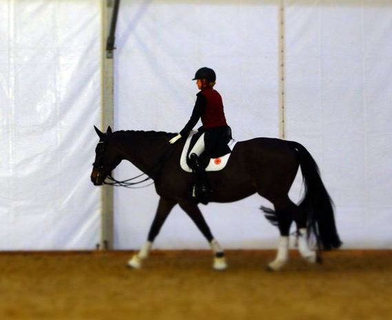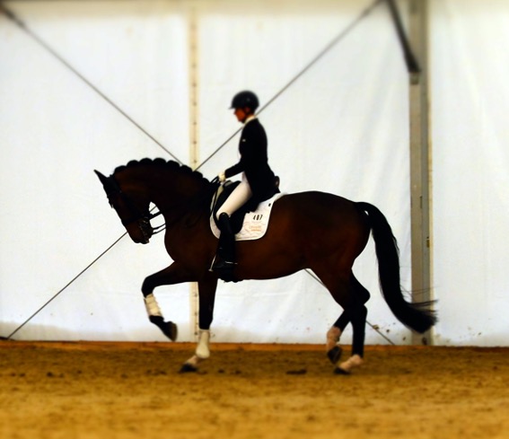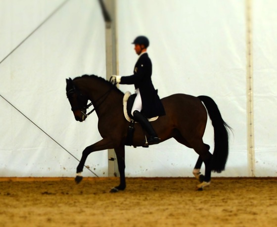 bereitet die Reiterin ihr Pferd eng eingestellt auf die Prüfung vor.