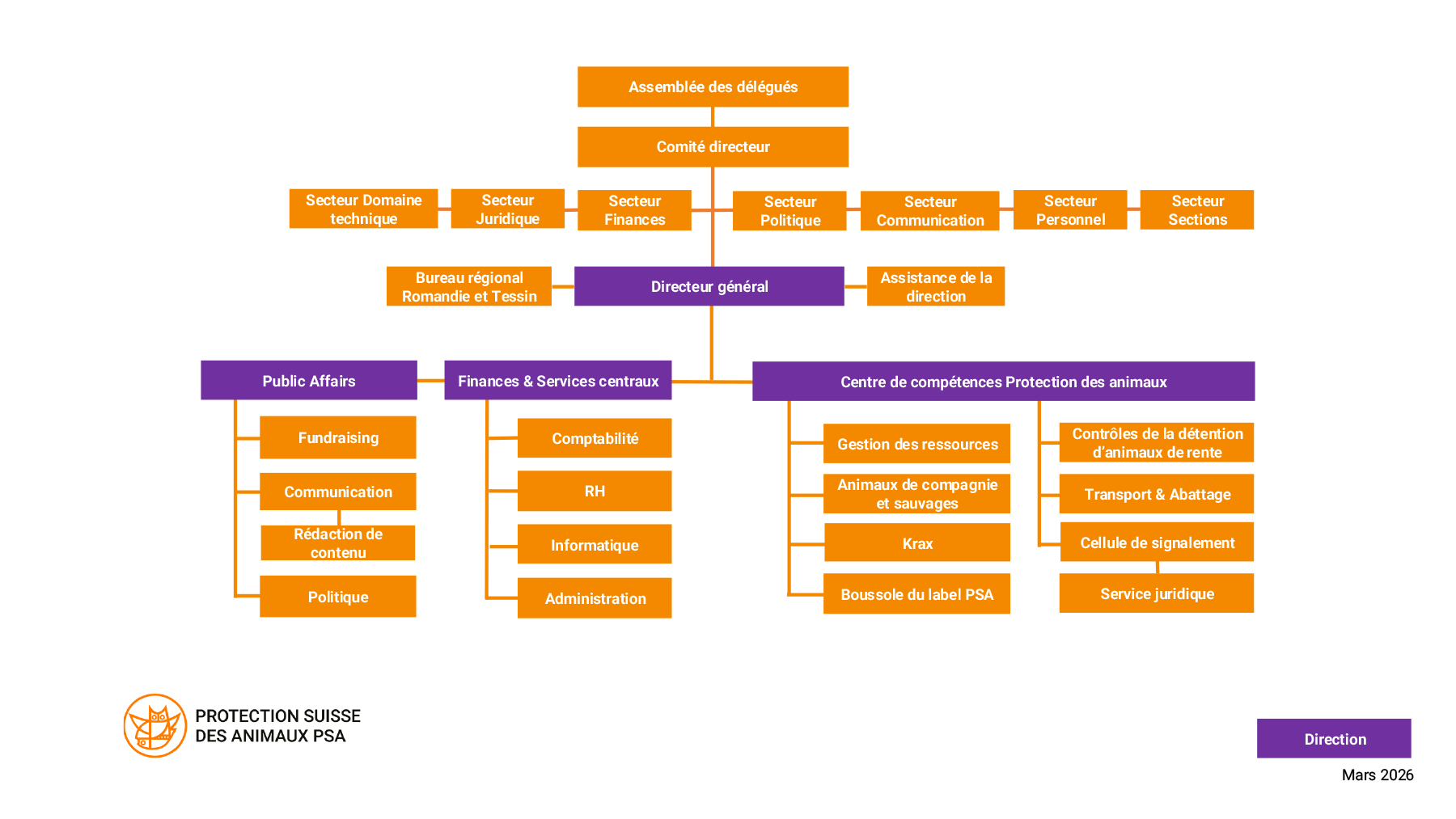 La Protection Suisse des Animaux PSA est une organisation faîtière, de forme associative. L’organe suprême est l’assemblée annuelle des délégués des sections. Elle élit entre autres le président ou la présidente et les membres du comité directeur.