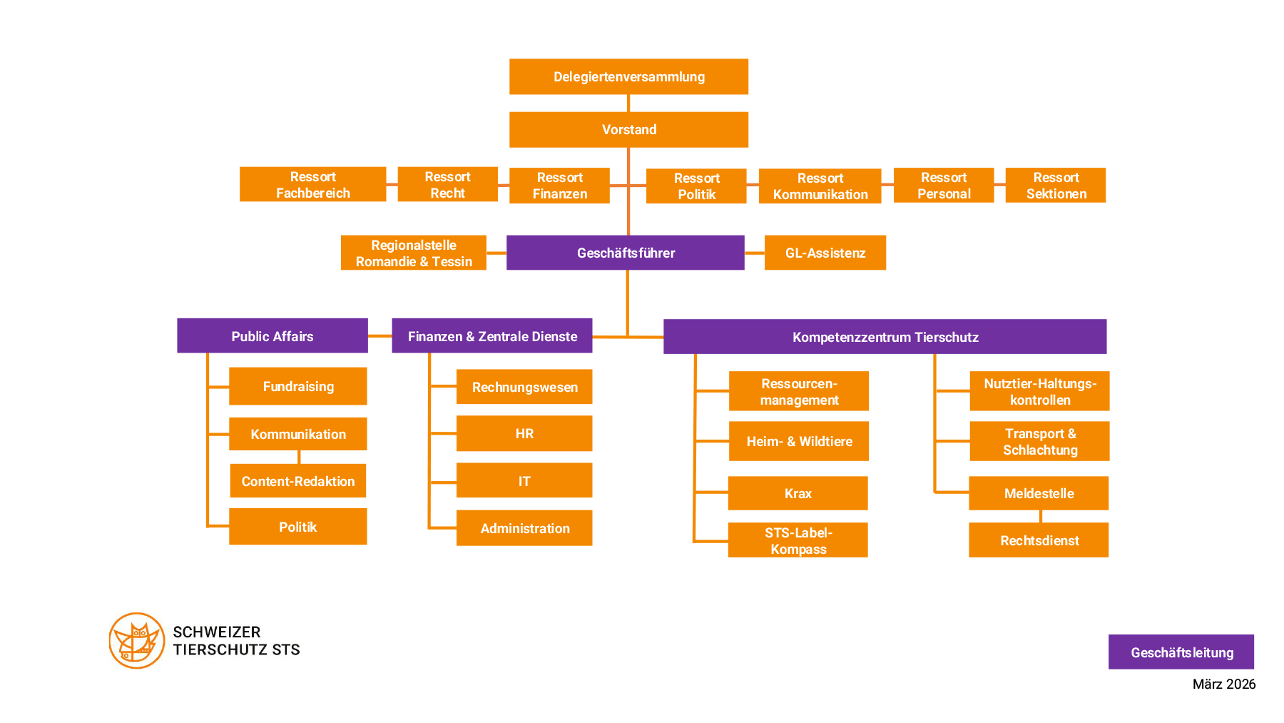 Die operative Leitung des STS liegt bei der Geschäftsleitung. Die Tierschutzarbeit wird von 80 Mitarbeitenden in den Fach- und Beratungsstellen geleistet. Sie informieren und beraten Tierhaltende, kontrollieren Tierhaltungen, Tiertransporte und Schlachthöfe, arbeiten mit Schulklassen am Thema Tiere sowie Tierschutz und setzen sich hartnäckig für strengere Tierschutzvorschriften ein.